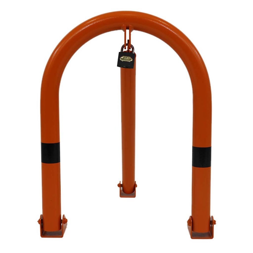 Blocator parcare tip arc Poarta Mini model BPP-03 portocaliu, 340x450 mm, lacat, dibluri, holsuruburi este special construit pentru blocarea locului de parcare.