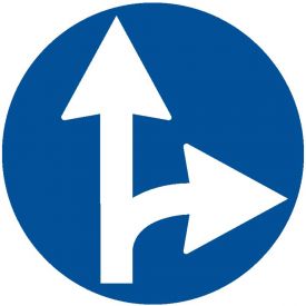 Inainte sau la dreapta, D4, indicator de avertizare, Protrafic, 600 mm, folie reflectorizanta clasa 1, otel vopsit, indicator de obligare se amplaseaza inaintea intrarii intr-o intersectie, obligand conducatorul auto sa circule pe una din directiile indicate de sageti. Actioneaza doar in intersectia inaintea caruia este instalat.