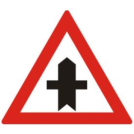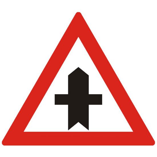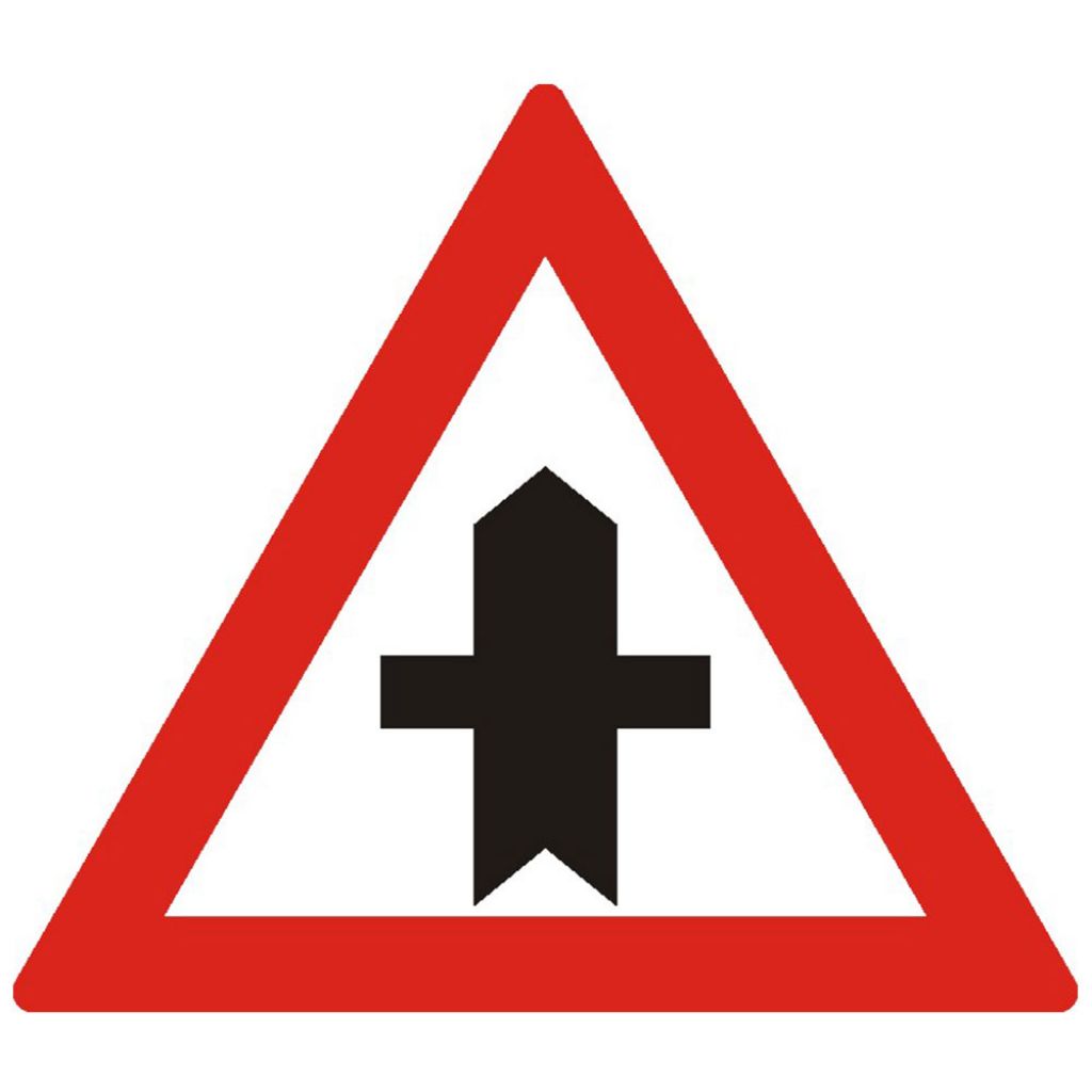 Intersectie cu un drum fara prioritate, A35, indicator de avertizare, Protrafic, 700 mm, folie reflectorizanta clasa 1, otel vopsit, indicator de avertizare se instalează pe drumul cu prioritate in intersecţiile din afara localităţilor. Conducătorii de vehicule care întâlnesc indicatorul au prioritate de trecere iar cei care circulă pe drumul transversal vor întâlnii unul dintre indicatoarele: "Cedează trecerea" sau "Oprire". Oprirea, stationarea, mersul inapoi intoarcerea sunt interzise cu 25m inaintea intersectiei ori in zona de preselectie unde sunt aplicate marcaje cu linie continua. Depasirea si intoarcerea sunt permise in intersectie. Pe timpul noptii si in conditii de vizibilitate redusa la apropierea de intersectie, conducatorii de autovehicule sunt obligati sa schimbe alternant lumina de intalnire cu cea de drum.