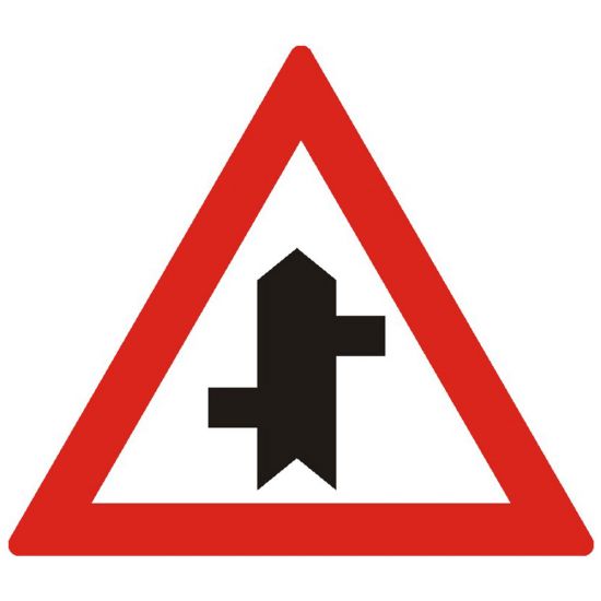 Intersectie cu un drum fara prioritate, A38, indicator de avertizare, Protrafic, 700 mm, folie reflectorizanta clasa 1, otel vopsit, indicator de avertizare se instalează pe drumul cu prioritate in intersecţiile din afara localităţilor. Conducătorii de vehicule care întâlnesc indicatorul au prioritate de trecere iar cei care circulă pe drumul transversal vor întâlnii unul dintre indicatoarele: "Cedează trecerea" sau "Oprire". Oprirea, stationarea, mersul inapoi intoarcerea sunt interzise cu 25m inaintea intersectiei ori in zona de preselectie unde sunt aplicate marcaje cu linie continua. Depasirea si intoarcerea sunt permise in intersectie. Pe timpul noptii si in conditii de vizibilitate redusa la apropierea de intersectie, conducatorii de autovehicule sunt obligati sa schimbe alternant lumina de intalnire cu cea de drum.
