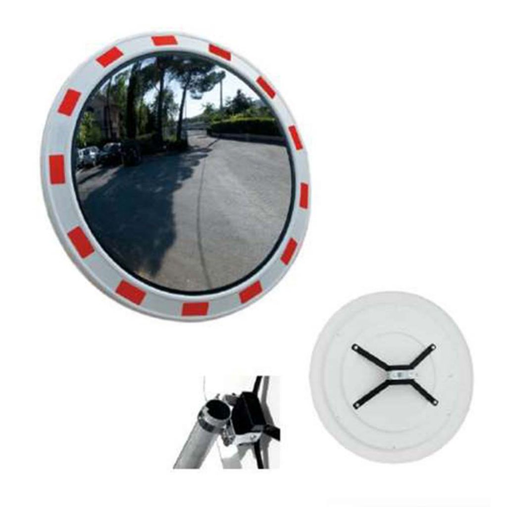 Oglinda rutiera rotunda diametru 600 mm cu bordura rosu-alb este confectionata din materiale plastice tratate pentru a asigura rezistenta mare la impact, intemperii, razele UV si praf.