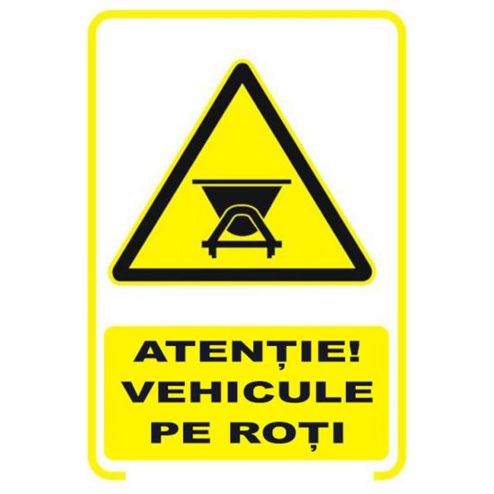 Semne si indicatoare / Placute de avertizare / Placuta indicatoare de securitate de avertizare, atentie, vehicole pe roti, Onsec, 200x300 mm, autocolant vinyl, 0.07 mm