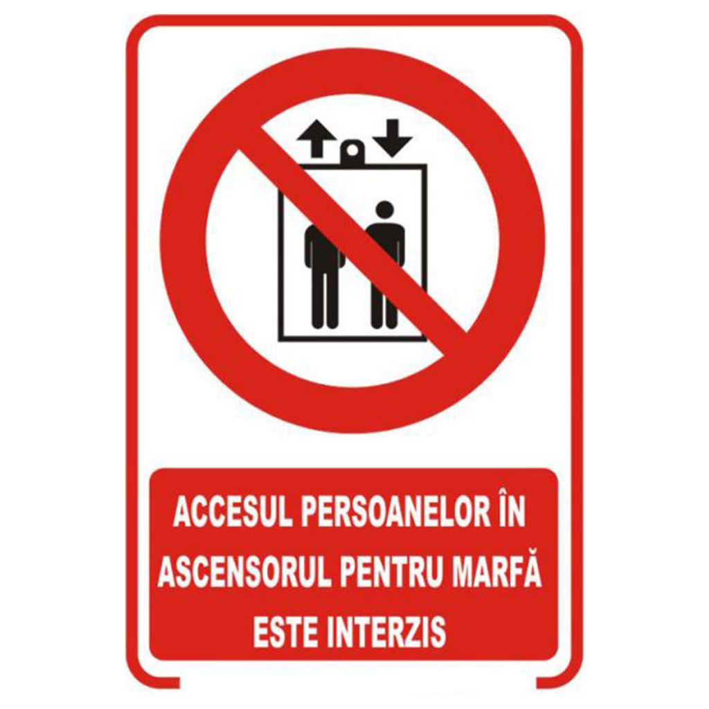 Placuta indicatoare de securitate de interzicere, accesul persoanelor in ascensorul pentru marfa este interzis, Onsec, 200x300 mm, autocolant vinyl, 0.07 mm