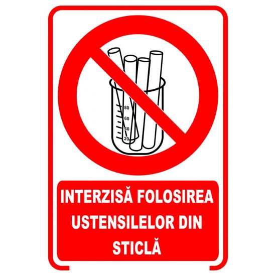 Semne si indicatoare / Placute de interzicere / Placuta indicatoare de securitate de interzicere, interzisa folosirea ustensilelor din sticla, Onsec, 200x300 mm, autocolant vinyl, 0.07 mm