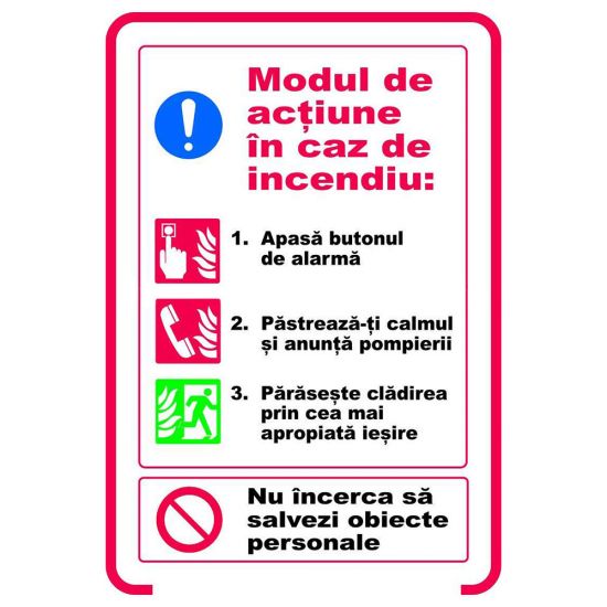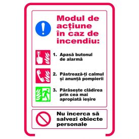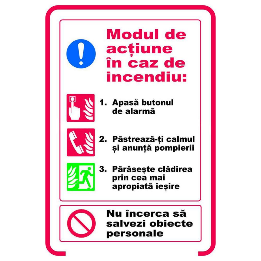 Placuta indicatoare de securitate pentru paza si stingerea incendiilor PSI, modul de actiune in caz de incendiu, Onsec, 200x300 mm, PVC, 3 mm