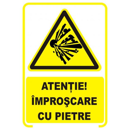 Semne si indicatoare / Placute de avertizare / Placuta indicatoare de securitate si avertizare, atentie, improscare cu pietre, Onsec, 200x300 mm, PVC, 2 mm