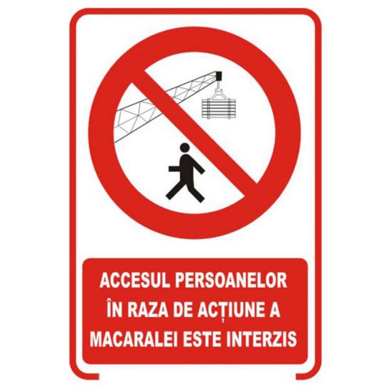Placuta indicatoare de securitate si interzicere, accesul persoanelor in raza de actiune a macaralei este interzis, Onsec, 200x300 mm, PVC, 1 mm.