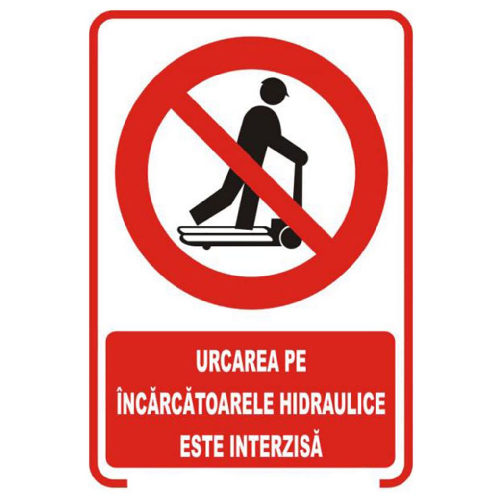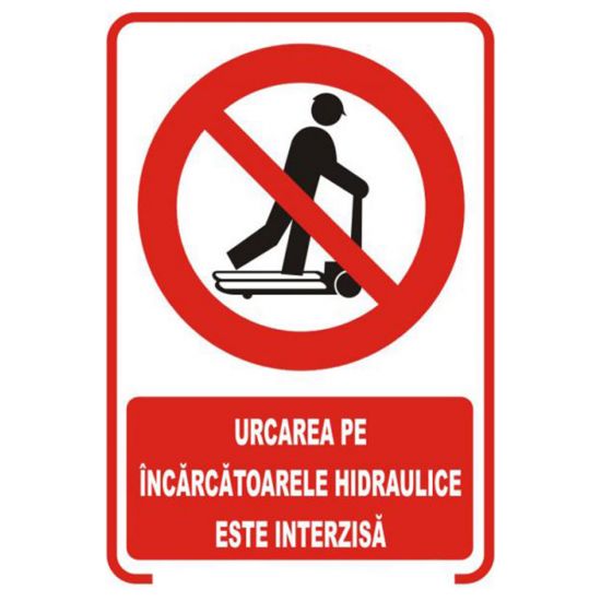 Placuta indicatoare de securitate si interzicere, urcarea pe incarcatoarele hidraulice este interzisa, Onsec, 200x300 mm, PVC, 2 mm
