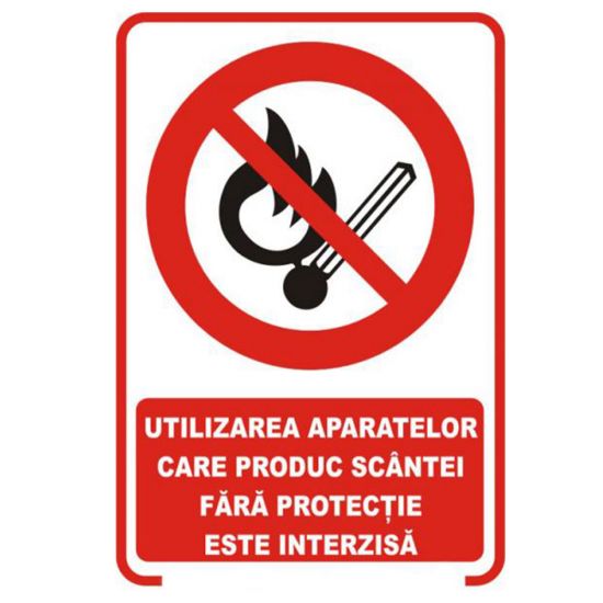 Placuta indicatoare de securitate si interzicere, utilizarea aparatelor care produc scantei fara protectie este interzisa, Onsec, 200x300 mm, PVC, 1 mm