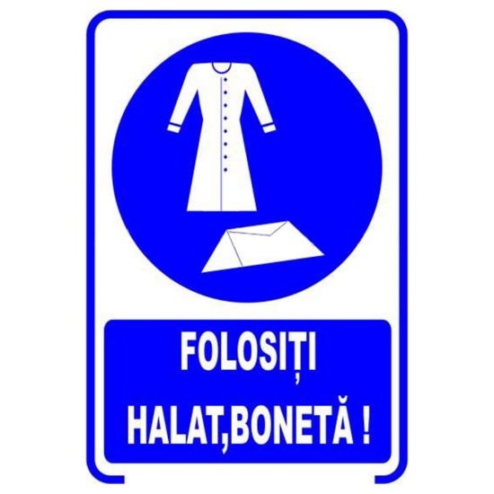Placuta indicatoare de securitate si obligativitate, folositi halat, boneta, Onsec, 200x300 mm, PVC, 2 mm