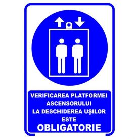 Placuta indicatoare de securitate si obligativitate, verificarea platformei ascensorului la deschiderea usilor este obligatorie, Onsec, 200x300 mm, PVC, 2 mm