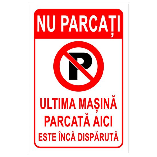 Placuta indicatoare parcare, nu parcati, parcarea interzisa, ultima masina parcata aici este inca disparuta, Onsec, 300x400 mm, aluminiu, 0.5 mm.