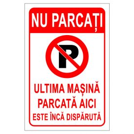 Placuta indicatoare parcare, nu parcati, parcarea interzisa, ultima masina parcata aici este inca disparuta, Onsec, 300x400 mm, aluminiu compozit, 2 mm.