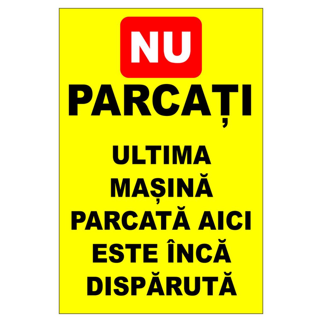 Placuta indicatoare parcare, nu parcati, ultima masina parcata aici este inca disparuta, Onsec, 200x300 mm, autocolant vinyl, 0.07 mm.