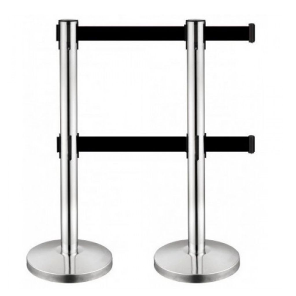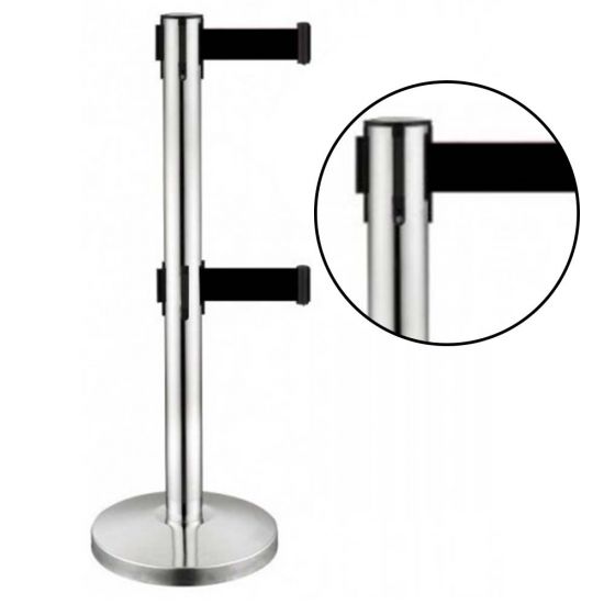 Stalp de ghidare si delimitare, argintiu, cu banda dubla retractabila, neagra, 3 metri folosit la delimitarea zonelor dintr-o anumita incepere unde nu este permisa intrare, la intrarea in restaurante sau hoteluri sau la diverse evenimente sau spectacole.