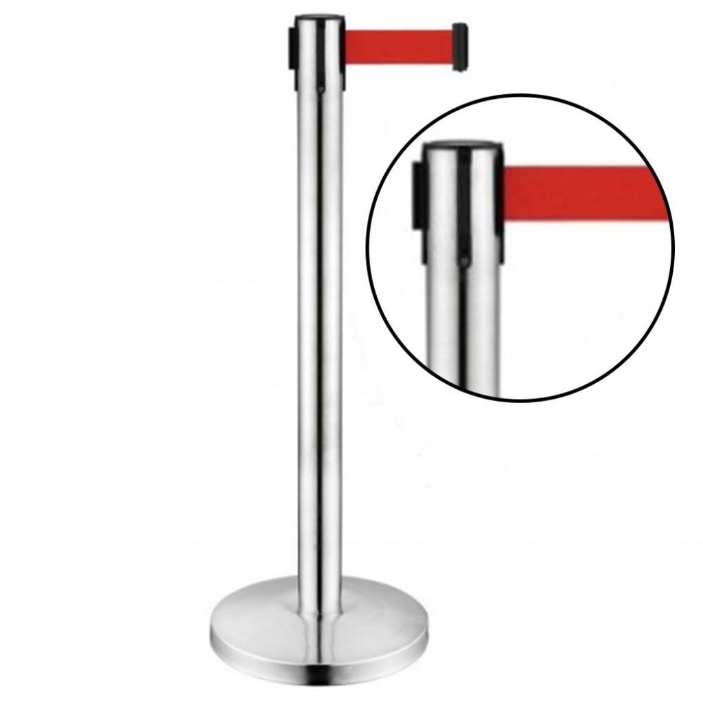 Stalp de ghidare si delimitare, cromat, cu banda retractabila, rosie, 2 metri