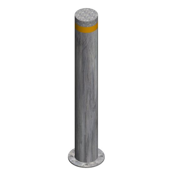 • Tot la partea superioara are aplicata o banda reflectorizanta galbena cu o latime de 50 mm.La partea inferioara are sudata prin sudura continua o flansa cu grosimea de 5 mm prevazuta cu 4 gauri pentru elementele de fixare, dibluri cu holsuruburi, ancore metalice sau alte solutii de fixare.